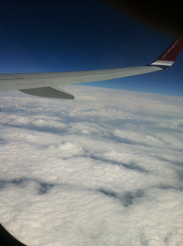 Embarcamos en el avión, esperando a que este se pusiera en marcha y sobretodo, calmando y alentando a Lara, pues tiene un poco de fobia a volar (y se portó como una campeona). El primer vuelo tendría a Oslo y huelga decir que fue un vuelo muy tranquilo, con el detalle mas notable a destacar: El avión disponía de WI-Fi a bordo, con el que pudimos ponernos en contacto con familiares y amigos mediante mensajes y fotografías. Fue una sorpresa muy agradable para todos el poder mantener el contacto con todo el mundo y mostrarles a los seres queridos nuestro vuelo recorriendo esos 2100 kilómetros que hay entre Barcelona y Oslo.