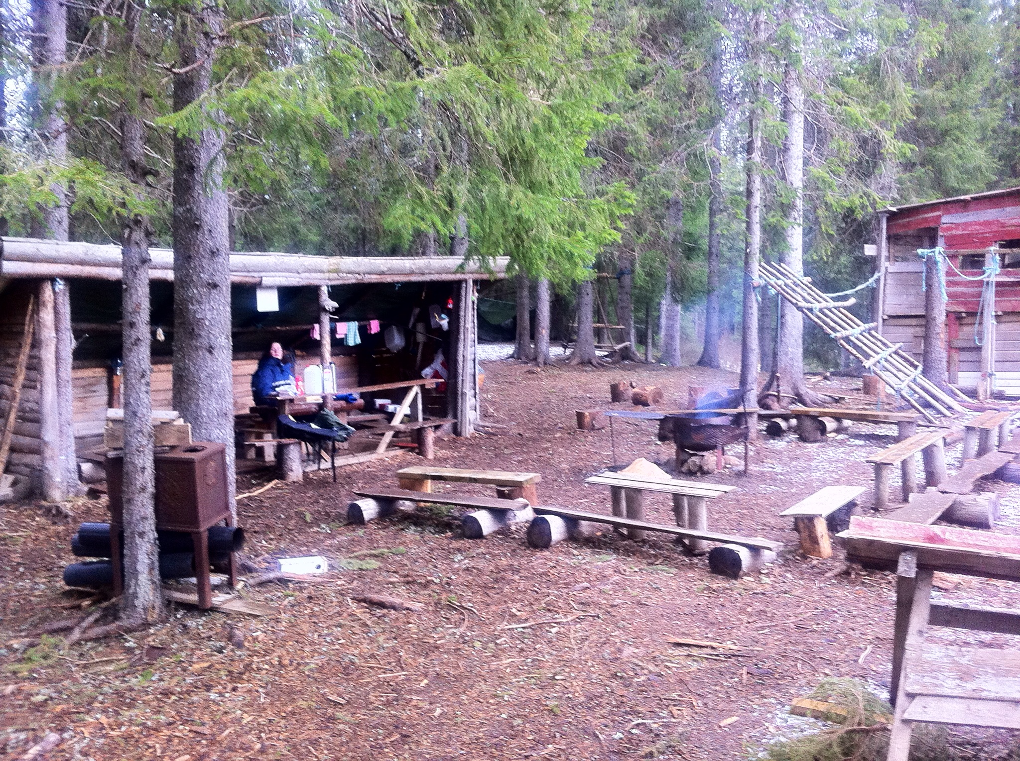 Y esa, amigos míos, es la dinámica de lunes a jueves. Y digo que es así durante los primeros cuatro días por que cuando llega el viernes, la clase de Los Conejos (así se llama la clase donde estoy yo) se va de excursión al bosque ubicado justo al lado de la guardería. Los niños se visten para la ocasión (como cuando van al patio, vamos) y traen consigo sus mochilas mientras Hilde y un servidor llevamos la bolsa con comida y bebida. Tras hacer el recuento correspondiente, niños y profesores caminamos por el bosque de robledales y abetos de gran altura a través de un estrecho y serpenteante sendero hasta llegar a un puente que sortea un riachuelo, hecho con tablas humedecidas por las inclemencias meteorológicas y tras el río, encontramos un pequeño campamento compuesto por un par de cabañas construidas con tablones, un inmenso tipi dotado con un estufa de leña y dos arcones donde guardan un sinfín de materiales para el mantenimiento del campamento. Aparte de diversas estructuras de juego, también construidas de forma rudimentaria con la madera de los arboles de alrededor, en el centro del campamento se encuentra una especie de brasas con las que los niños calientan su comida y estos se sientan en minúsculos bancos, alrededor del rugiente fuego. Me llama la atención como los noruegos enseñan a edades muy tempranas a su prole, ese contacto tan vivo con la naturaleza. Ese contacto que personas como yo, que vienen de grandes urbes como Barcelona, hemos ido olvidando con el paso del tiempo.