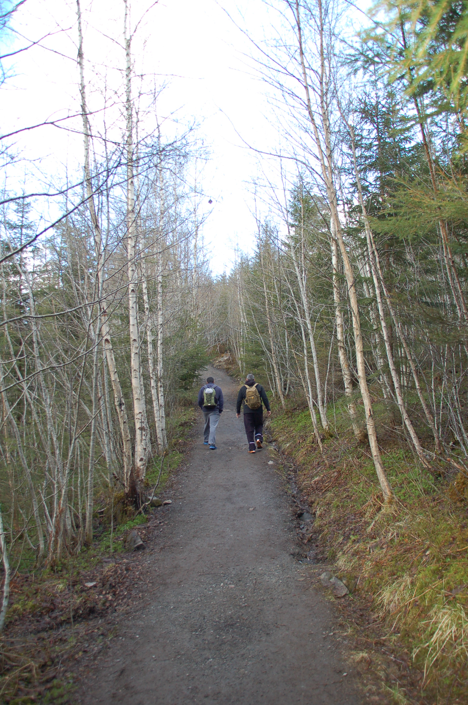 El trayecto se inició en el pequeño bosque que rodea el cementerio de Steinkjer y se erige hasta el sendero que lleva a Trana, una pequeña llanura de donde parten dos caminos: uno largo y de pendiente pronunciada y otro de kilómetro y medio con pendientes moderadas. Decidimos no tentar a la suerte y seguimos por la segunda opción, avanzando sin prisa pero sin pausa hasta su cima, donde se halla el Peilehytta, la cabaña que durante la Segunda Guerra Mundial se utilizó como estación de comunicaciones para captar señales de radio del Ejercito Alemán y posteriormente, durante la Guerra Fría, lo propio con las emisoras rusas.