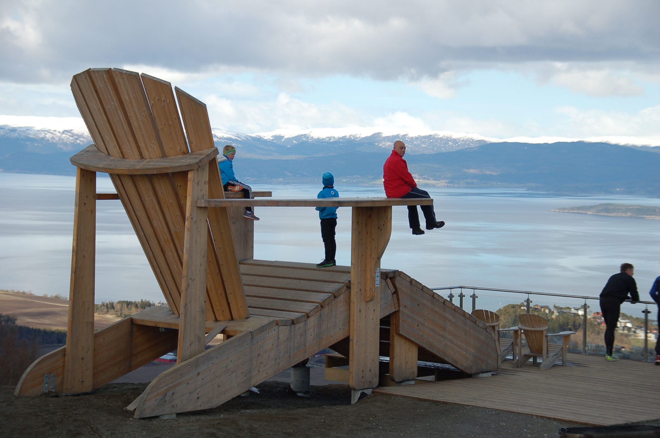 Finalmente, nuestros pies dieron con la cima; una inmensa antena de radio se erigía en lo más alto, junto a la pequeña cabaña donde banderas noruegas ondeaban con la brisa. Y justo al borde opuesto de la cima, una silla de cinco metros construida en madera forma parte del paisaje del lugar y es el foco de atención de todo aquel que se aventura al Oftenåsen y quiere hacerse una fotografía sobre ella.