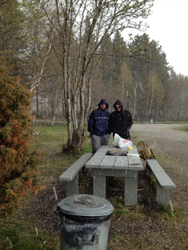 El señor Murphy, con perdón, a veces es un poco cabrón y de vez en cuando, más frecuentemente que raramente, agua la fiesta de cualquiera en un abrir y cerrar de ojos; justo cuando nos introducíamos el último trozo de manzana como postre en nuestras bocas, empezó a granizar hielo del tamaño de las bolas de Porexpán con que embalamos los objetos delicados. Empezamos a reír y a contar las múltiples formas con las que Dios decide adoptar forma y honrarnos con su presencia aquí, en Noruega: Niebla, lluvia torrencial, ventisca invernal o Bolas de Porexpán. El señor Murphy, con perdón de nuevo, es un poco cabrón pero aquella vez nos permitió realizar una estupenda barbacoa al pie del fiordo en un país nórdico como Noruega; algo que sin duda mi especial visita habrá sabido apreciar y recordará.