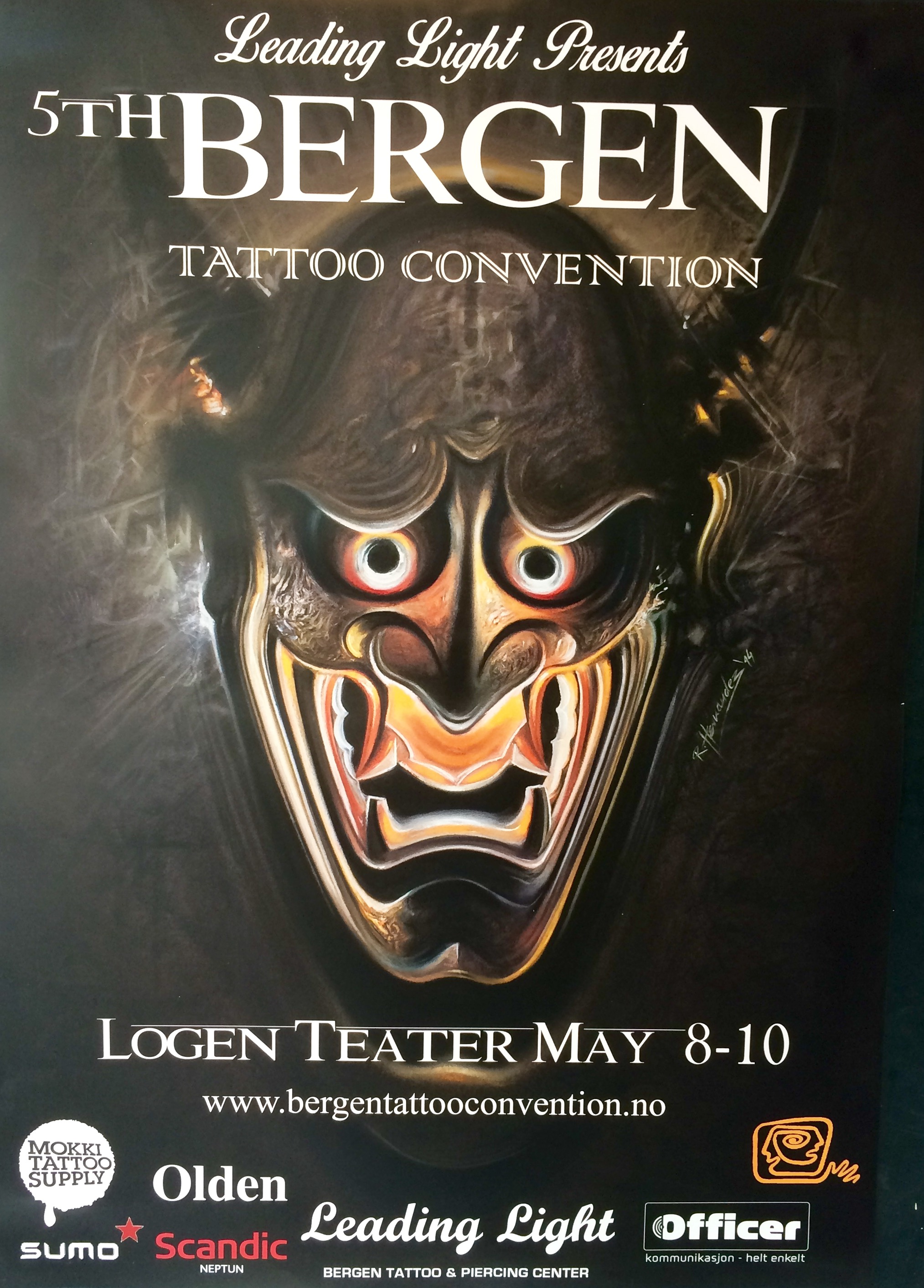 Comí algo rápido y decidí entrar de nuevo al Logen Teater para visitar a Lola en sus quehaceres (y por supuesto, hacer uso del pase gratuito). La convención estaba aun más concurrida que el día anterior y se notaba que había concursos sobre el mejor tatuaje en color o en blanco y negro. El ruido de las máquinas era incesante (bueno, salvo para el amigo danés que tatúa a mano y para Lola, que usa una maquina que no hace ruido). Ya, cotilleando en el interior del teatro, me topé con Fernando Oddone, un hombre que se dedicaba a pintar artísticamente y elaboraba carteles artesanales con absoluta maestría. De hecho, vi a algunos tatuadores que ya habían adquirido algún cartel suyo como expositor y francamente, estuve muy tentado a comprarle uno pero eran realmente caros y no traía conmigo tantos fondos como para realizar semejante compra. «El arte no es gratis«, dicen. Vaya si es verdad.