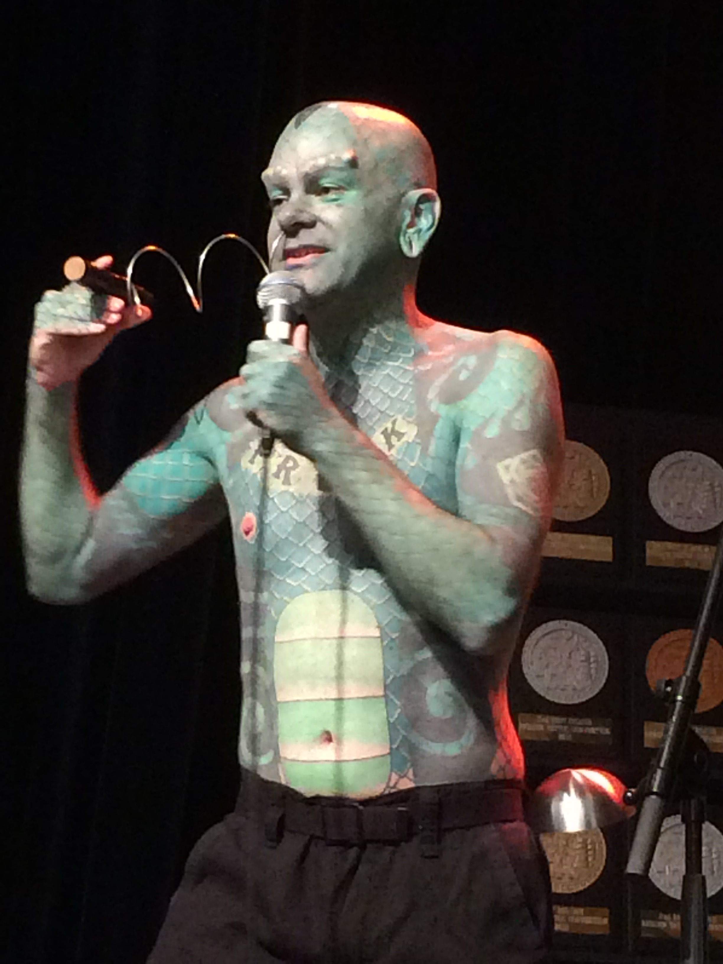 Me puse en manos de Lola y en unas horas hubo terminado con el trabajo, que tal como dije antes, es espectacular. Desde aquí, muchas gracias, Lola, por tu trabajo y sobretodo, por tu buena acogida al evento. Terminó justo para poder yo presenciar uno de los espectáculos más extraños que yo haya visto: el evento contaba con la presencia de Erik Sprague, mundialmente notorio como «The Lizard Man» (El hombre lagarto), un hombre de cuarenta y tres años natural de Austin, Texas, que posee todo el cuerpo tatuado a modo de escamas de lagarto, como propiamente su alias indica y en su rostro se pueden apreciar múltiples injertos que le dan un aspecto de reptil. Con la lengua bífida y los dientes limados para terminar de darle un aspecto aún más reptiliano, este curioso individuo deambula por el mundo haciendo lo que en su pecho uno puede leer: FREAK, es decir, ser una rareza y hacer su espectáculo particular y sin par. Al principio creía que iba a realizar una sesión de monólogos al más puro estilo «Club de la Comedia» pero tras su espectáculo, uno se queda absolutamente perplejo: Haciendo gala de su habilidad para efectuar movimientos linguales independientes (movimientos circulares de cada parte de la lengua en sentido horario y anti-horario a las agujas del reloj, arriba/abajo y abrir/cerrar), que era ya brutal, lo posterior a ese ejercicio no se puede describir con meras palabras, así que…. lo mejor, es que veáis las siguientes imagenes: