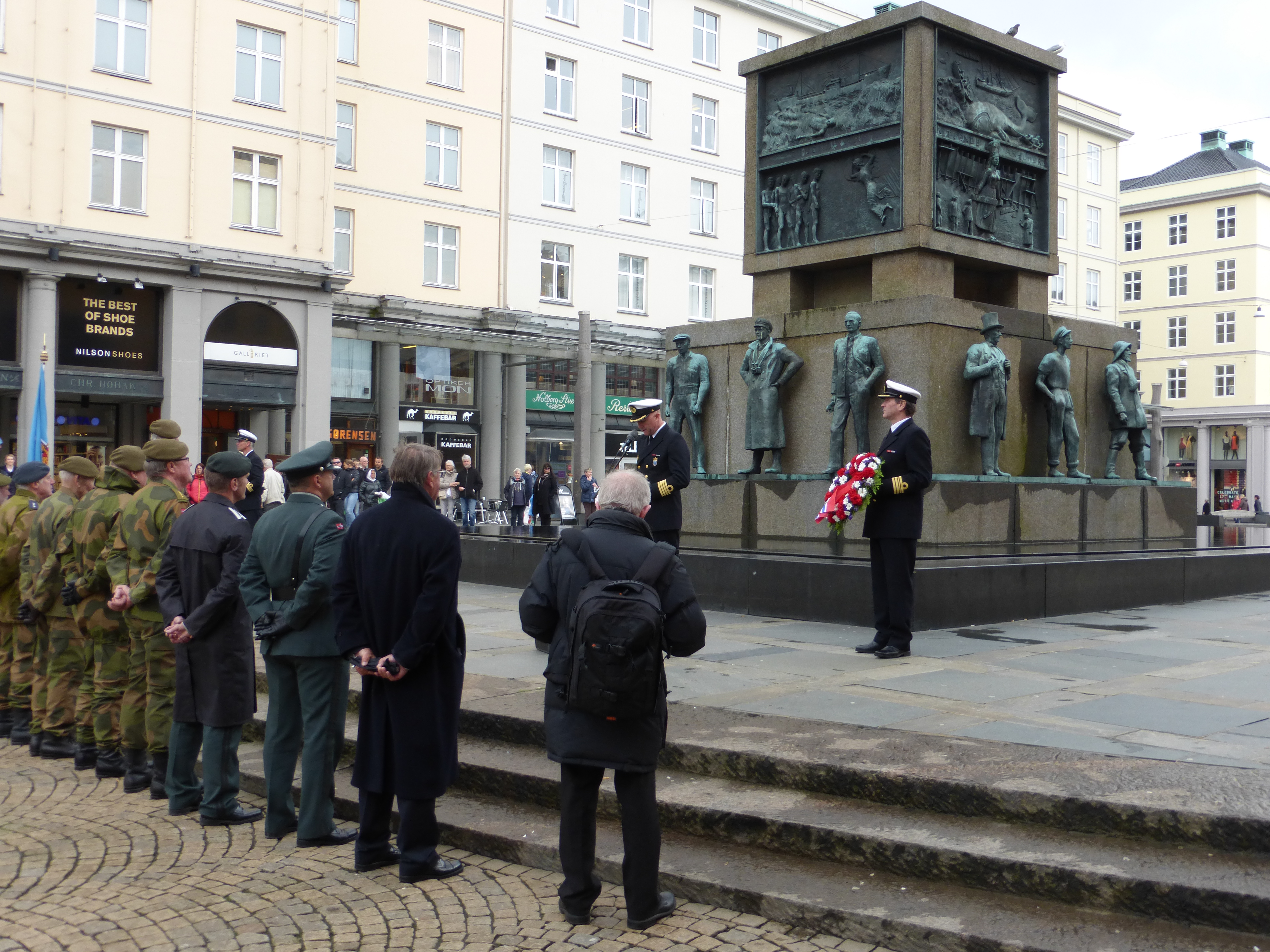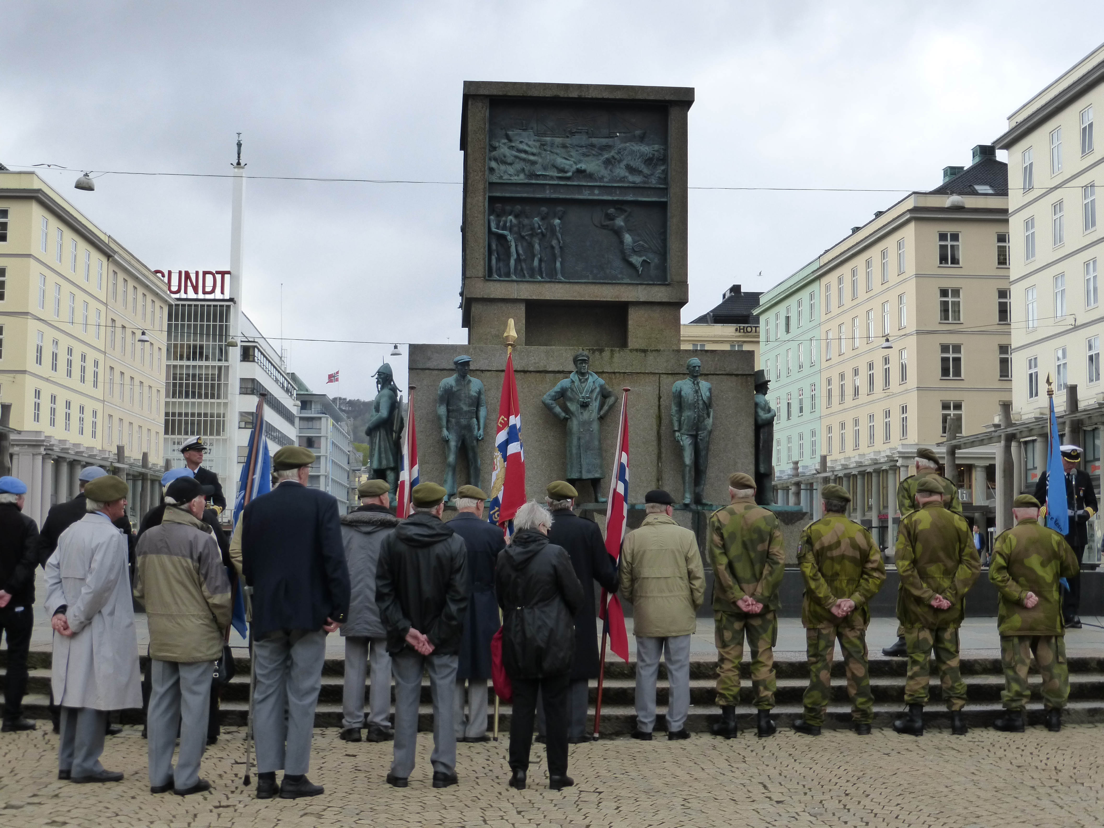 Tras salir de su hotel, seguí caminando hasta encontrarme con la plaza que daba al Sjømannsmonumentet (El monumento al Marinero) y me di cuenta de que un numeroso grupo de soldados, veteranos de Marina principalmente, se habían congregado delante del monumento y la banda militar redoblaba los tambores. No había caído que era ocho de mayo y se trataba del Frigjøringsdagen (Día de la Liberación/Día del Veterano), día de la conmemoración del final de la Segunda Guerra Mundial, la victoria Aliada en Europa y este año hace exactamente setenta años de aquello. En Noruega, debido a que fue un país ocupado por el Ejercito Alemán, su celebración es realmente importante y era normal encontrarse con muchos veteranos de Marina reunidos y portando su uniforme de gala (Bergen tiene la base principal del La Marina Real Noruega). A mi, la vida militar siempre me ha atraído y francamente, al ver a algunos ancianos ataviados con su viejo uniforme, saludando al monumento mientras recordaban a sus camaradas muertos en combate, emocionados hasta ver brotarles lagrimas de los ojos, hizo que me embargara la emoción a mi también. Estuve incluso a punto de realizar saludo militar por simple empatía. Una vez terminaban el saludo y callaban los tambores, caminaban despacio y en silencio hasta el siguiente monumento que conmemorase a los soldados de antaño para repetir el ritual. Pude ver asimismo y del mismo motivo, desfilar a los Buekorps (Cuerpo de Arqueros), brigadas de niños portando estandartes y réplicas de lo que fueron las ballestas de hace años o rifles modernos. Los Buekorps aparecieron por primera vez en Bergen en 1850 y forman parte de las tradiciones de la ciudad. Tras vivir aquel día lleno de patriotismo y enaltecimiento a su bandera, un piensa lo realmente bonito que es esa sensación de orgullo para con su patria, su bandera, su pueblo. Algo parecido al que yo siento al ser catalán, obviamente.