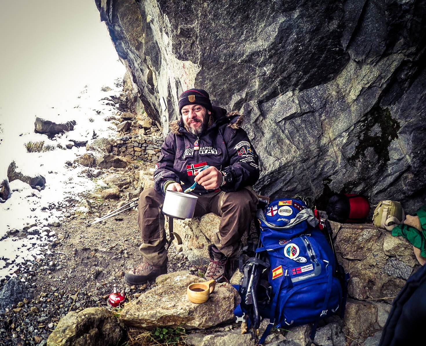 Nos hallábamos a mil quinientos metros de altura, desayunando nuestro humeante café y nuestra comida calentada con un simple fogón mientras saboreábamos aquel momento frente las nevadas montañas, percibiendo el olor a monte, a contaminación ausente, a naturaleza, mientras otras personas desayunan en el bar de debajo de su casa, viendo la televisión. Eramos libres y allí queríamos estar. Carpe Diem: saboreamos aquel único y precioso instante.