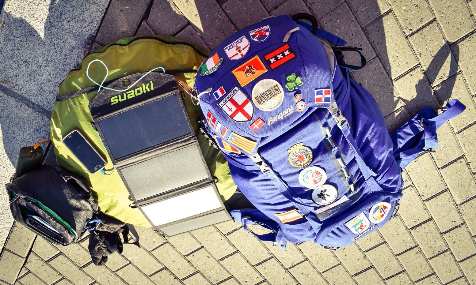 Para el viaje me procuré de mi querida Wanderlust -mi mochila azul de 65 litros de capacidad de la marca Bergans of Norway que hasta la fecha ha sido testigo de un sinfín de lugares visitados-, la tienda de campaña y la cámara de fotos. Por supuesto, contando con que trataría de no ir a ningún lugar donde pasar la noche, me agencié un cargador solar de 25 vatios con el que trataría de cargar el teléfono móvil lo máximo posible.