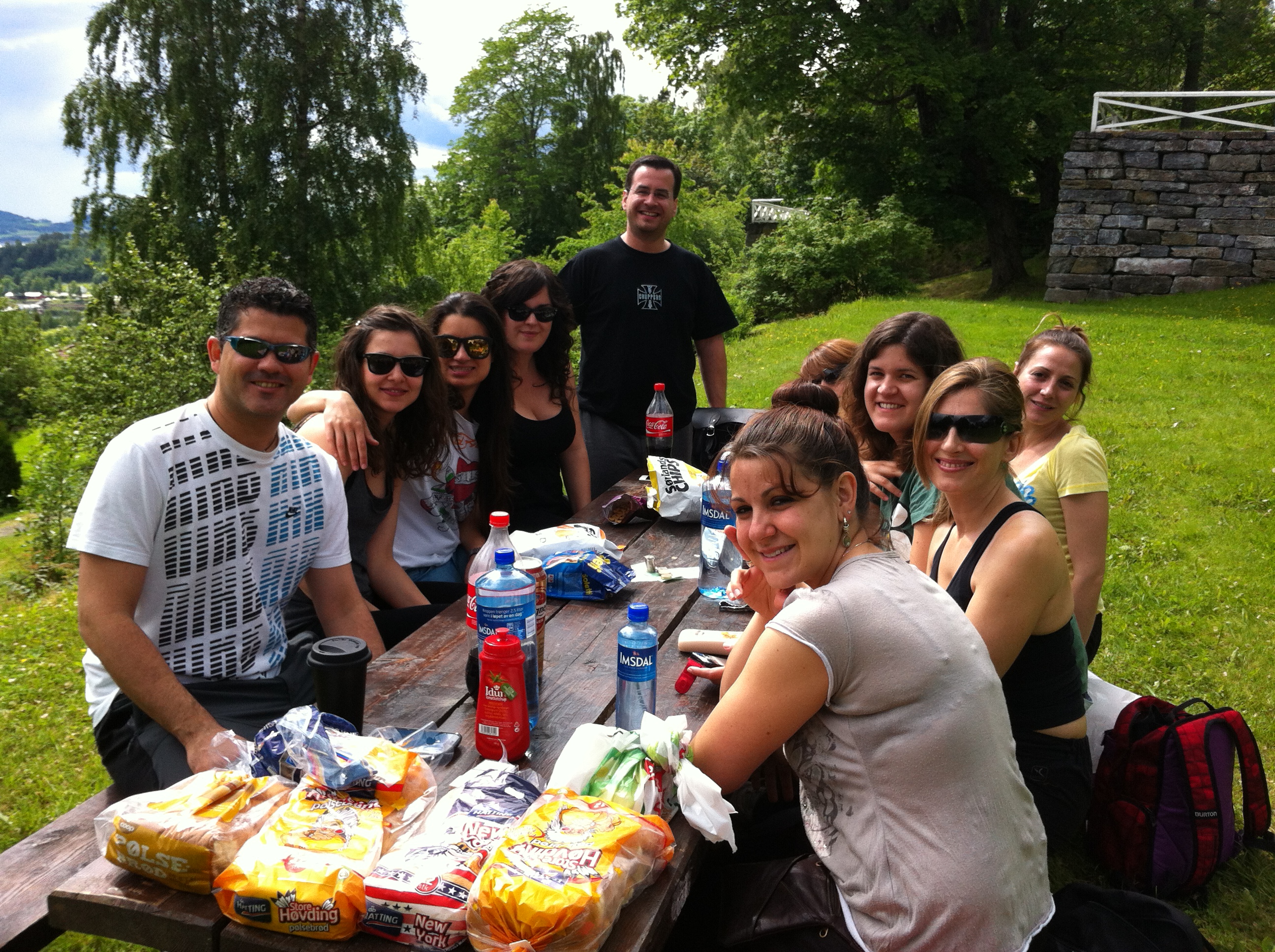 Después de levantarnos tras una velada fiestera repleta de jolgorio en el Onkel Oskar (como no) para celebrar el cumpleaños de Carlos (31 primaveras, Gratulerer med da’n!!), que tuvo lugar el día 11, hemos decidido que hoy era un día idóneo para organizar una barbacoa todos juntos. Nos hemos vestido y hemos ido a comprar avituallamiento: paquetes de salchichas, bolsas de pan para perritos calientes, patatas, queso y agua para 10 personas. Como eramos bastantes para desplazarnos hacia la iglesia de Egge, cuyo lugar estaba especialmente adecuado para hacer el picnic campestre de hoy, Carlos ha realizado un par de viajes con La Bestia para llevarnos a todos. También han venido Mar y Sergio desde su apartamento en coche para no perderse la comida de hoy.